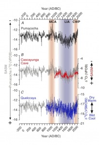 Now comes more evidence still, this time from South America. In a study published this month in the Proceedings of the National Academy of Sciences, researchers at the University of Pennsylvania found that Peru was warm during the Medieval Warm Period. Although South American civilization of 1000 years ago didn’t leave behind a rich historical record for experts to assess, sediment deposits in a Peruvian lake had a story of their own to tell. Based on the researchers’ analysis of the lake bed’s composition over the last 2300 years, they were able to unearth data showing Peru’s temperature to have been in line with that elsewhere during the Medieval Warm Period.